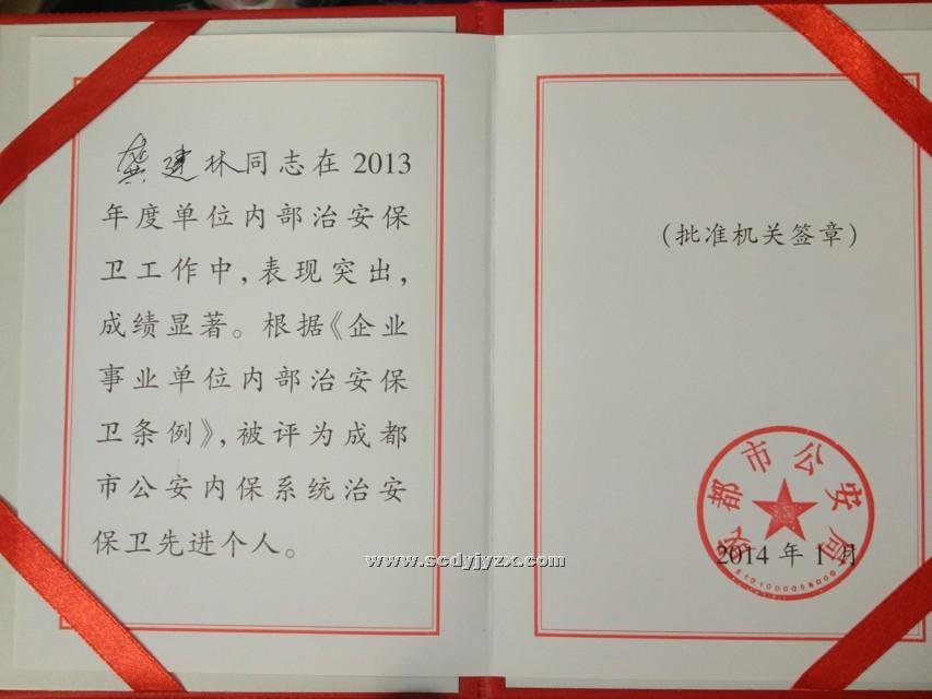 热烈祝贺我校安全办公室主任——龚建林,在2013年单位内部治安保卫工作中,表现突出,成绩显著。被成都市公安局评为成都市公安内保系统治安保卫先进个人。
