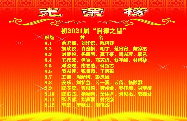 为进一步践行大邑县“1511”发展思路,落实学生习惯养成教育,培养学生线上学习和宅家自主管理的自律性,保证线上学习的效率和宅家身心的健康,疫情期间,四川省大邑中学初中部开展了“三自”德育之“行为自律”教育活动,通过评选“自律之星”,树立典型,激发全体同学的自律意识,共同营造宅家学习的自律氛围。2020年4月7日,通过全校各班的积极行动,根据学生宅家学习生活表现进行综合考评,一颗颗闪亮的“自律之星”脱颖而出。