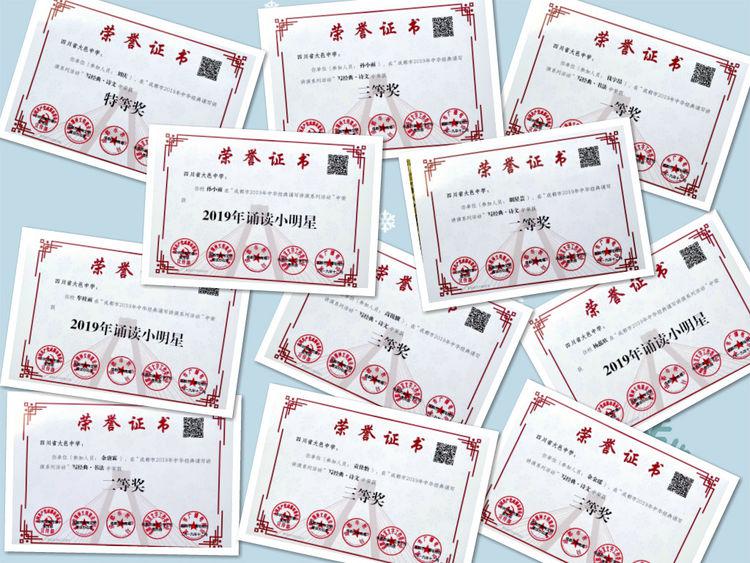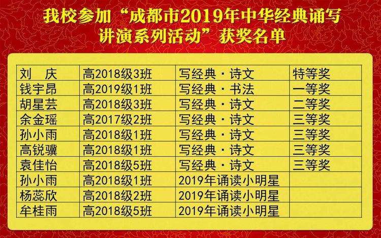 为深入贯彻党的十九大及省市党代会精神,培育和践行社会主义核心价值观,传承巴蜀文明,发展天府文化。我校积极参与市委宣传部、市精神文明办、市教育局、市语委、市广播电视台联合举办的“成都市2019年中华经典诵写讲演系列活动”,发挥优势,集中参与“写经典”活动,不负众望,载誉而归。