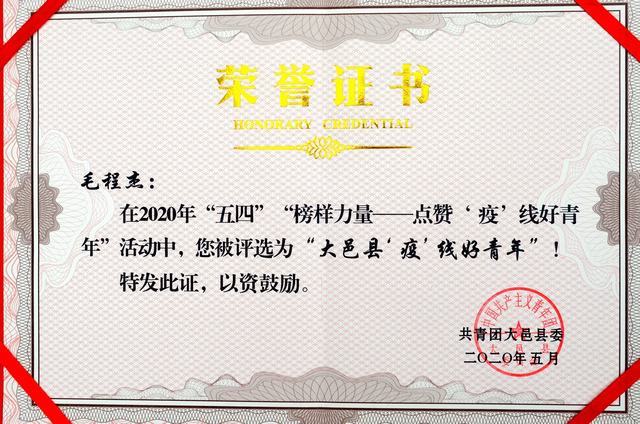 我校团委书记毛程杰被团县委评为2020年大邑县“疫线”好青年