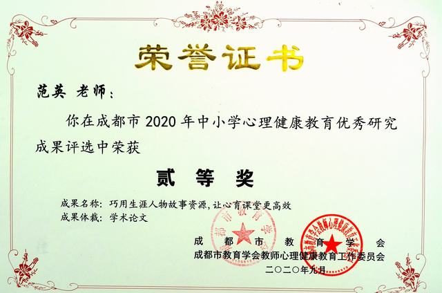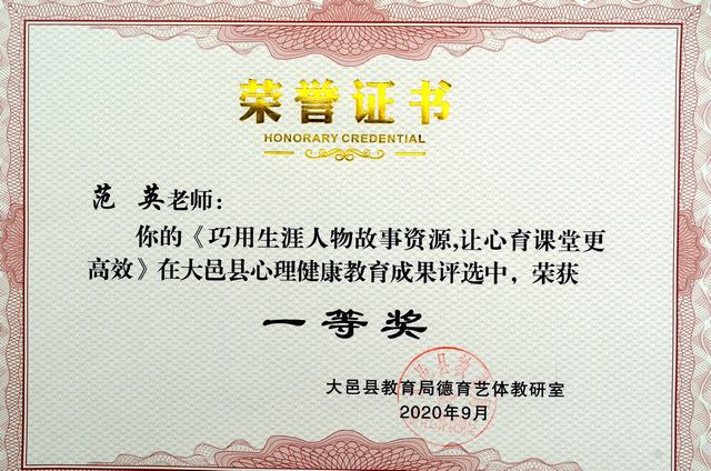 我校教师范英荣获2020年心理健康教育成果评选市二等奖、县一等奖