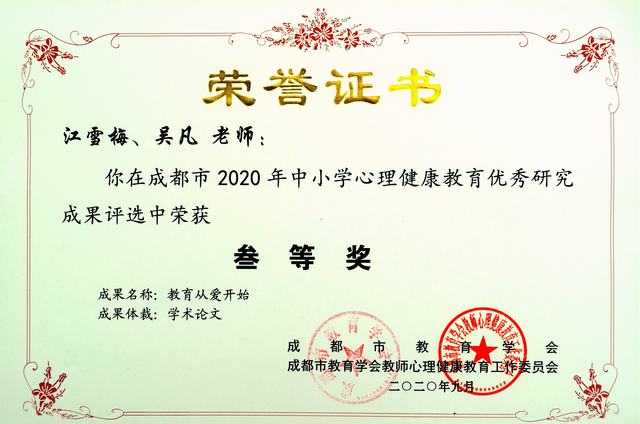 我校教师吴凡、江雪梅荣获2020年心理健康教育成果评选市三等奖、县二等奖