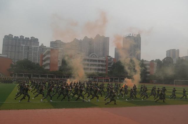 应急疏散及消防逃生综合演练后,伴着雄壮有力的《义勇军进行曲》,大会在庄严的升旗仪式中开始。高2020级全体新生气宇轩昂、英姿勃发,在教官的带领下,列着整齐的队伍,以嘹亮的口号、严密的纪律、过硬的素质进行汇报演出。
