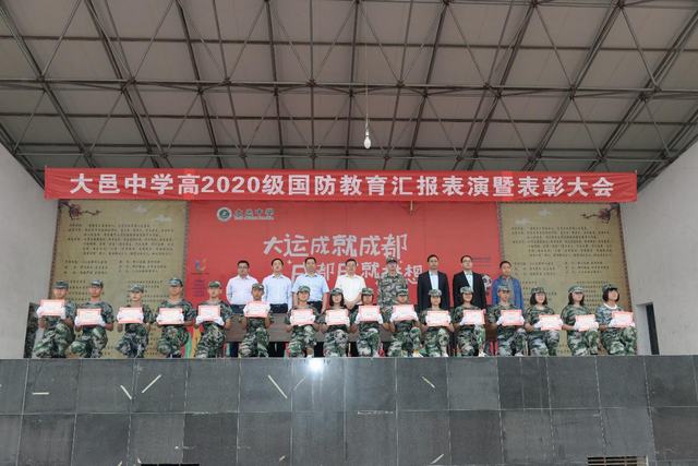 神采飞扬,无上荣光 9月30日上午9:00,高2020级国防教育汇报表演暨表彰大会于大邑中学足球场正式开始。此次活动包含应急疏散及消防逃生综合演练、汇报表演和表彰大会。出席的领导有大邑县教育局党组成员、副局长、大邑中学党总支书记顾剑波,大邑县人民武装部军事科科长、少校高宇,大邑中学副校长蔡刚,副校长刘进军,校长助理母建民。