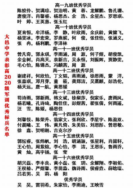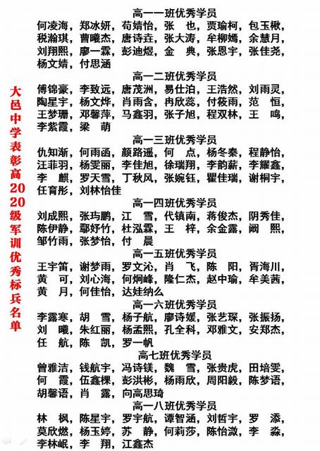 高2020级军训优秀学员名单