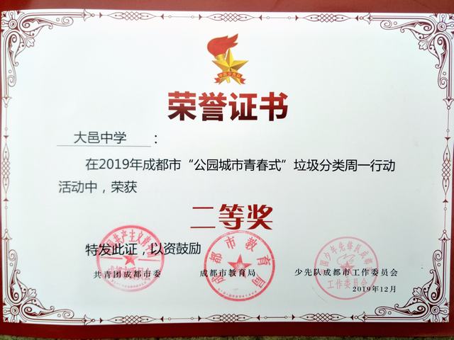 我校在2019年成都市“公园城市青春式”垃圾分类周一活动行动中荣获二等奖