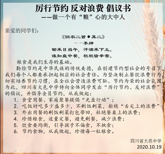 勤以修身、俭以养德。为进一步贯彻习近平总书记 “制止餐饮浪费行为,切实培养节约习惯”“在全社会营造浪费可耻,节约光荣的氛围”的重要指示精神,结合我校“三自德育”课程之“大美慧心”,引导全体师生发扬勤俭节约的优良作风,养成良好的生活习惯,滋养节俭勤德之美,2020年10月,大邑中学开展了以“光盘行动涵养节俭之美”为主题 的“光盘行动”系列活动。