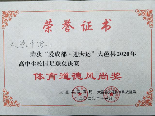 我校荣获“爱成都、迎大运”县2020年高中生校园足球总决赛体育道德风尚奖
