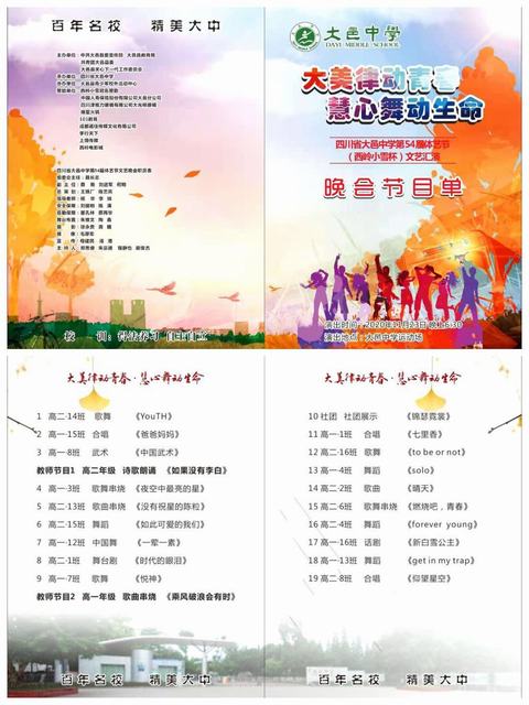 为了全面深入贯彻党的教育方针,落实落细立德树人的根本任务,结合我校三自德育课程“大美慧心”,以美育人,以美化人,大力推行书香校园之美、强健体魄之美、艺术灵动之美,11月23日晚,四川省大邑中学隆重举行了以“大美律动青春,慧心舞动生命”为主题的第54届体艺节文艺晚会。