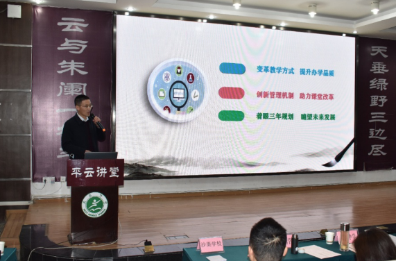 大邑中学副校长宋仕平,以“自主育人谋未来,创新发展谱新篇”为题介绍了推进混合式学习工作的经验:变革教学方式,提升办学品质,课堂是课程改革的核心,是人才培养的主渠道;深化课程改革,抓住“一个核心”,让学生乐学、会学、学好;创新管理机制,助力课堂改革。学校课堂教学改革总体要求和基本原则是减负增效,应用尽用。落实“1+3”新常态管理模式,平台资源和功能使用;制定三年规划,瞻望未来发展。提出了着重于学校管理的顶层设计以及落实推进措施。