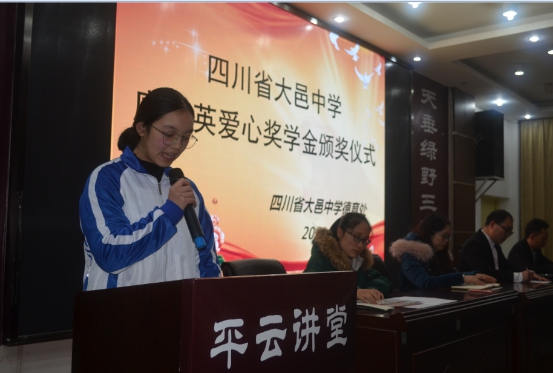 接下来,由高一年级获奖同学发表获奖感言。他表示:作为一名唐仲英爱心奖学金获得者,在以后的学习生活中,一定会秉承唐仲英基金会“服务社会,奉献爱心,推己及人,薪火相传”的宗旨,用自己的实际行动去帮助、影响更多的人。