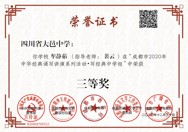 我校学生在“成都市2020年中华经典诵写讲演系列活动—写经典中学组”中获奖