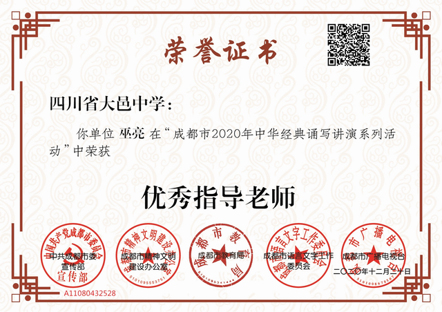 我校教师巫亮在“成都市2020年中华经典诵写讲演系列活动”中荣获优秀指导老师称号
