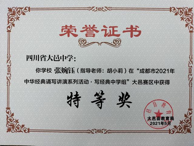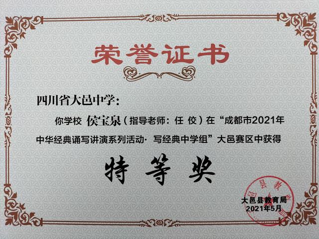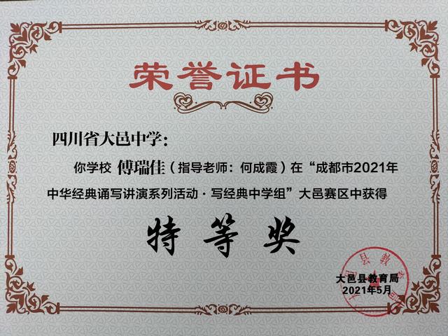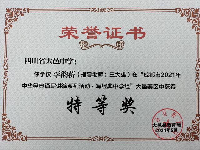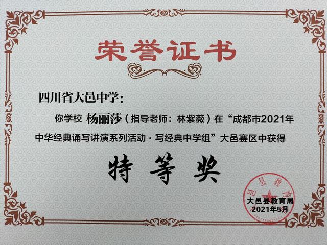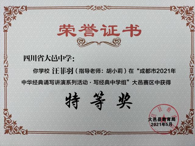 我校学生在“成都市2021年中华经典诵写讲演系列活动—写经典中学组”大邑赛区中荣获特等奖