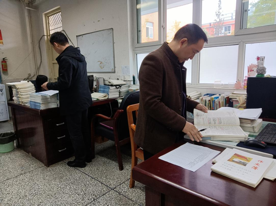 检查组在教务处主任侯佚的带领下先后来到初一、初二、初三年级教师办公室,按学科要求依次展开检查。教师备课检查侧重于集体备课共案、基于学情分析的二次备课个案、教学反思的撰写。作业板块检查的重点是语文、英语学科的作文、听写、默写的批改情况,学生作业修改、订正的跟踪情况,数学、物理、化学练习册的批改情况。同时检查组还对各学科随堂小练习的批改、订正情况进行了检查。