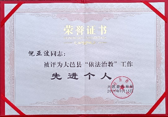 为落实依法治国基本方略,全面推进依法治教,9月17日,大邑县教育局对2020-2021学年我县“依法治教”工作成效突出的部分学校和个人进行表彰,我校喜获“大邑县‘依法治教’工作先进集体”荣誉称号,教师何明亮、倪亚波喜获“大邑县‘依法治教’工作先进个人”荣誉称号。