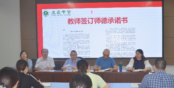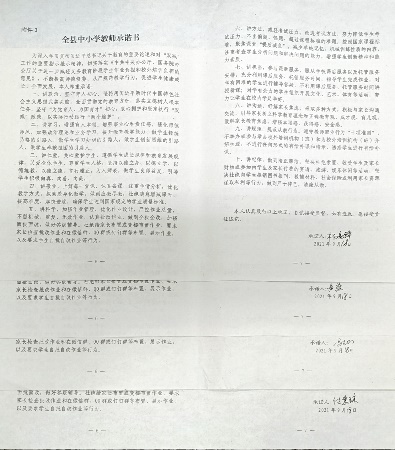 为深入学习贯彻习近平总书记关于教育的重要论述和对“双减”工作的重要指示批示精神,切实落实《“双减”意见》,不断提高师德修养,从严规范教学行为,促进学生健康成长、全面发展,会上,初中部校长王波组织全体教师认真学习《新时代中小学教师职业行为十项准则》、《四川省中小学教师违反职业道德行为处理实施细则》,并签订《全县中小学教师承诺书》。