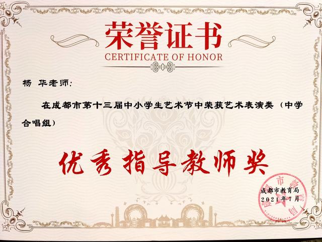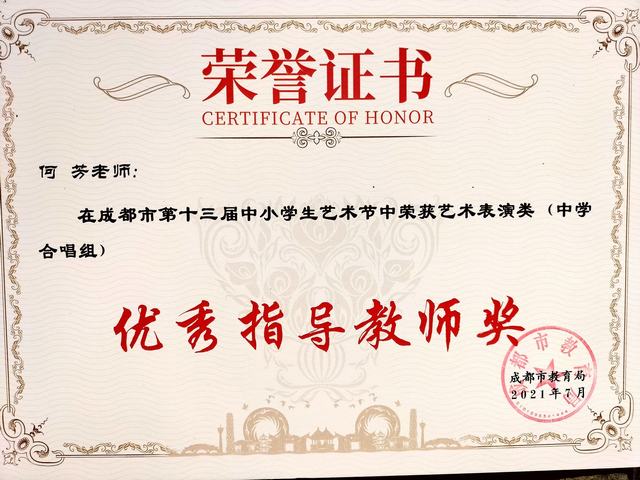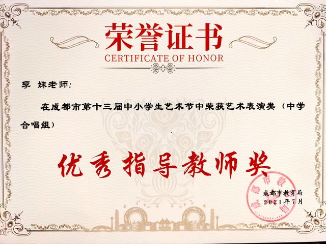 我校教师在成都市第13届中小学生艺术中荣获“优秀指导教师奖”