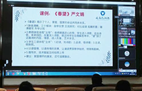11月25日,在成都市教育科学研究院组织的“技术赋能,教学变革——2021年成都市混合式教学研讨活动”中,刘源工作室学员严文娟以《春望》为研讨课例进行远程网络直播展示。