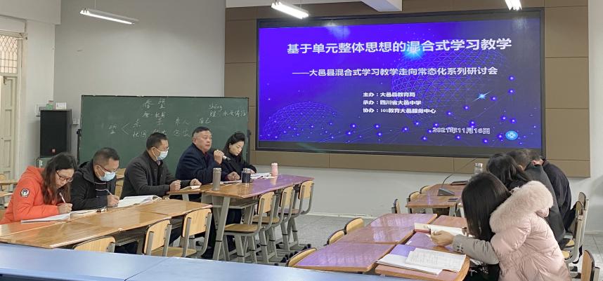为进一步贯彻落实“双减”政策,助推全县“混合式学习教学”常态化工作,提高课堂质效,2021年11月16日,大邑县刘源名师工作室全体成员参加在大邑中学举办的大邑县“混合式学习教学观评课”在线研讨活动。工作室研修学员严文娟执教八年级语文课《春望》,工作室导师刘源、县教育局中学教研室副主任邓子祥、县教育局中学语文教研员付晋以及县域内参与在线研讨的学校代表作评课交流。
