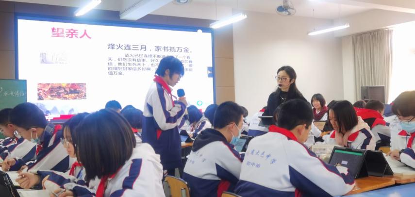 研讨课上严文娟老师结合学科单元主题思想,实施“混合式学习教学”,先学再教,以学定教,通过板块式教学,一线贯之解读杜甫的家国情怀,借助随课微写升华课堂认知。