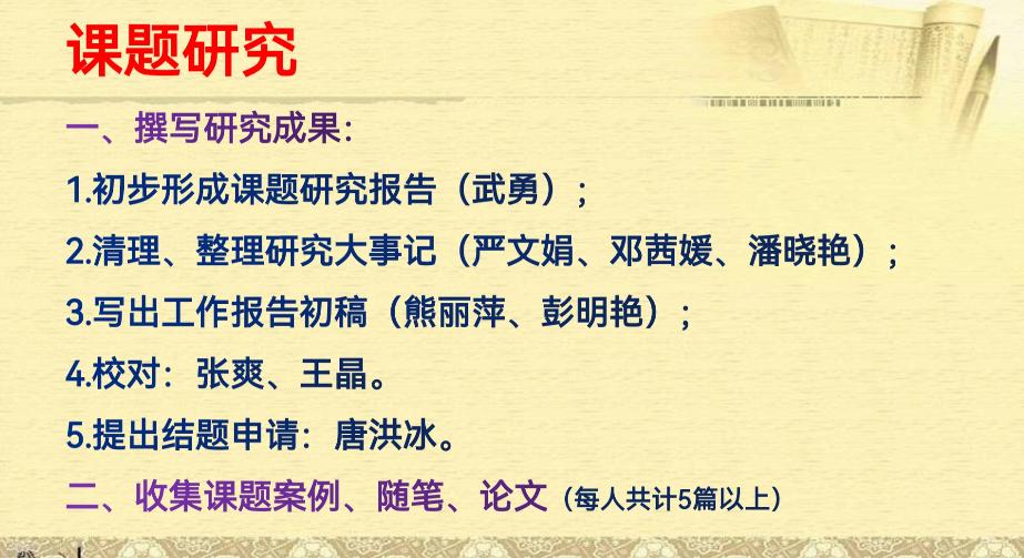 随课微写”是刘源名师工作室自2018年9月以来开展的课题研究,至今已有2年半时间。随着研究的深入和成果的显现,已具备结题的条件。为此,在本次研讨会上,工作室就结题工作的相关准备工作进行具体布置,如撰写研究成果、研究大事记、工作报告、结题申请等。刘源老师希望工作室成员借此次课题研究,对教学科研有专业而清晰的认识,并逐步培养科研能力,进一步提升学术水平。
