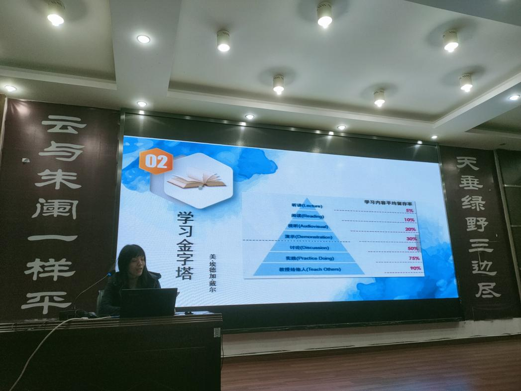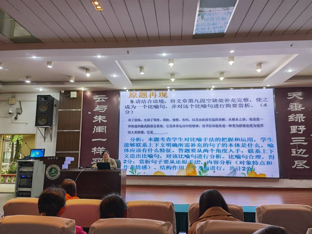 邱元春老师代表安仁镇学校语文备课组做题为《九层高台,起于累土》的分享。她结合心理学家的研究成果,高屋建瓴,理论联系实际,从宏观上分享其备课组“聚焦中考考点,提高教学效率”的做法。
