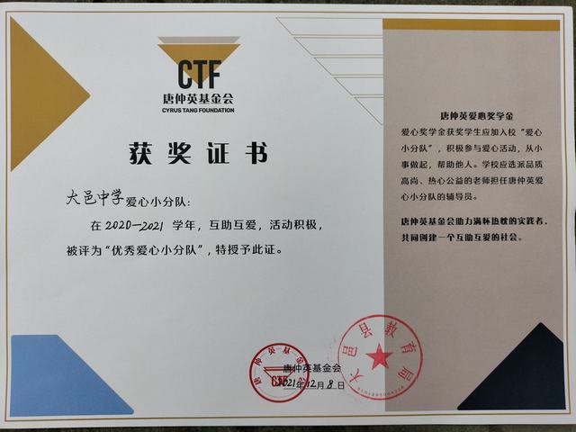 大邑中学荣获2020-2021学年唐仲英基金会“优秀爱心小分队”