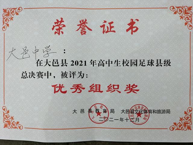 大邑中学在大邑县2021年高中生校园足球总决赛中荣获优秀组织奖