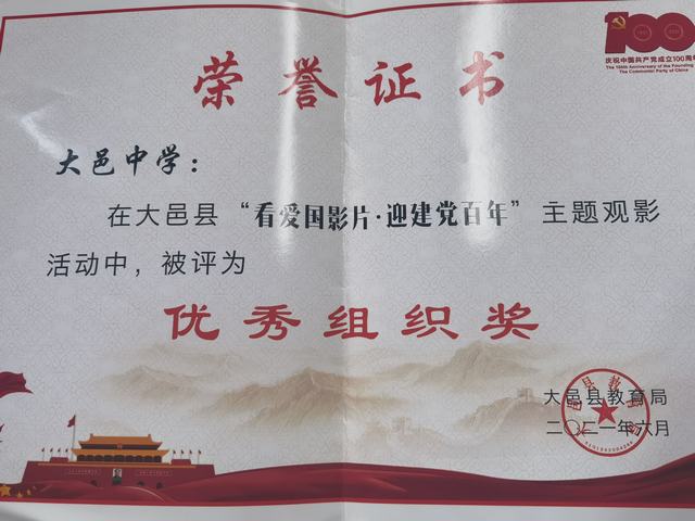 我校在县“看爱国影片、迎建党百年”主题观影活动中荣获优秀组织奖