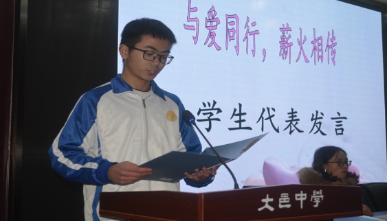接下来,由高一年级获奖同学发表获奖感言。他表示:作为一名唐仲英爱心奖学金获得者,在以后的学习生活中,一定会秉承唐仲英基金会“服务社会,奉献爱心,推己及人,薪火相传”的宗旨,用自己的实际行动去帮助、影响更多的人。
