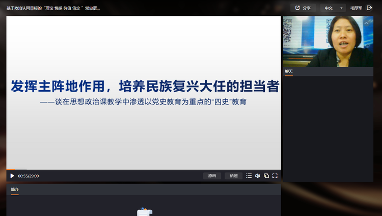 其次,政治组李文惠老师带来主题为《发挥主阵地作用,培养民族复兴大任的担当者——谈在思想政治课教学中渗透以党史学习教育为重点的“四史"教育》的专题讲座。