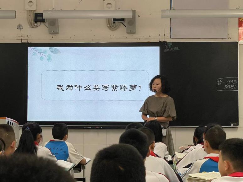 熊丽萍在《紫藤萝瀑布》一课中,让学生学会描写的角度和描写方法。整堂课熊老师以“通过作者的描写,你看到了一棵怎样的紫藤萝”为问题驱动,引导学生勾画出描写紫藤萝的句子,然后让学生分别从修辞手法、描写角度、描写顺序等方面梳理归纳出写景状物的写作方法,并学以致用,让学生结合校园美景来训练描写技巧。