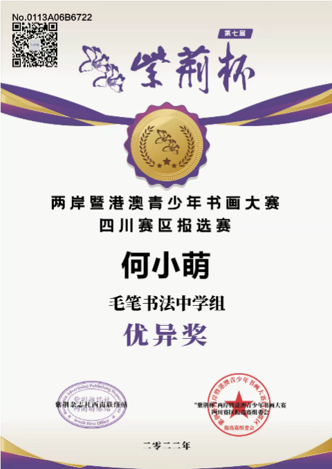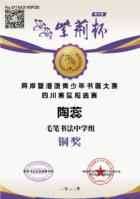 为切实推进“双减”政策,落实五育并举要求,弘扬中华优秀传统文化,四川省大邑中学开展丰富多彩的社团活动,培养大中学子感受美、欣赏美的觉知力,提升创造美、展示美的专注力,挖掘学生的内在潜能,丰富学生课余生活。 近日,我校组织学生参加第七届“紫荆杯”两岸暨港澳青少年书画大赛,载誉而归。我校学子泼墨挥毫,瞩意美景、人物、抗疫等,用行动弘扬民族文化精髓,演绎书画神奇魅力。
