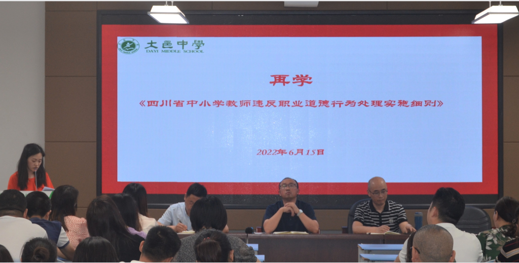 会议最后,大邑中学副校长、初中部负责人王波寄语全体教师,并对师德师风提出工作要求。他强调,师德师风建设工作是一项常态化的工作,需要我们长期扎实地开展。全体教师要以案为鉴,增强依法执教意识,坚守为党育人、为国育才的初心,不断提升个人师德素养,爱岗敬业,廉洁从教,争做党和人民满意的“四有”好老师。