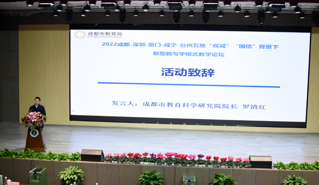 成都市教育科学研究院院长罗清红在致辞中提出,本次会议对于推动“双减”和教育教学质量发展,具有重要意义。他希望通过实验区建设,推动“双减”落地,用技术手段赋能教育,减掉原来教育中的赘余,向着优化教学、提升质量的目标不懈努力。他还作了“七朵云:创造智能时代共享教育的全息空间”的专题报告,从成都共享优质教育资源的使命出发分享了成都经验。