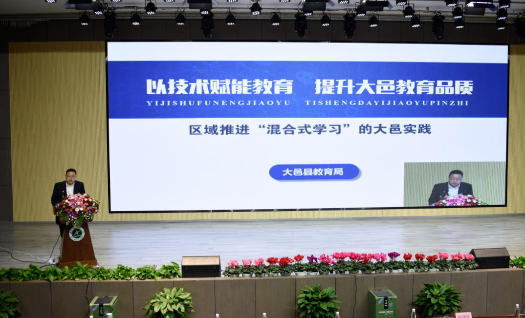 大邑县教育局副局长、四川省大邑中学党委书记顾剑波代表成都市国家级教育信息化教学实验区市级先导区发言。他指出大邑县信息化课改工作在成都市教育局、成都市教科院的指导和帮助下,大邑县教育局努力实践“混合式学习”,变革学生学习方式的工作。从“主要做法、取得成效”两方面向大家汇报大邑县的信息化课改工作。为进一步推动信息技术与课堂教学深度融合,全县有14所信息化课改实验学校,走出了一条“构建智慧课堂,实施混合式学习教学”的坚实的课改之路。