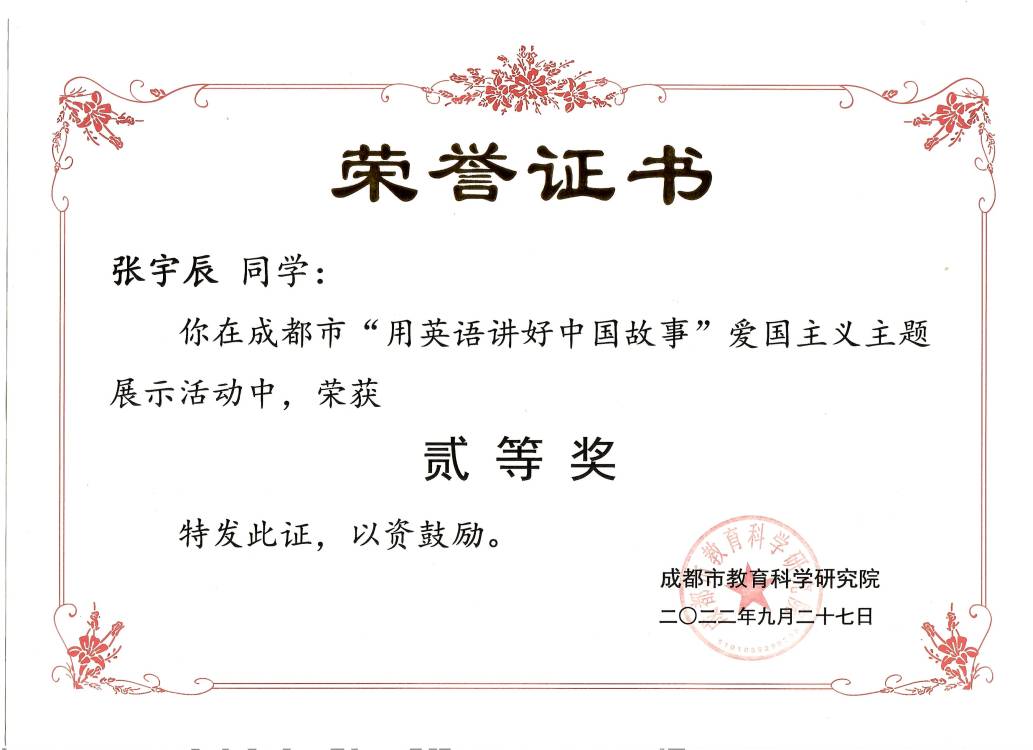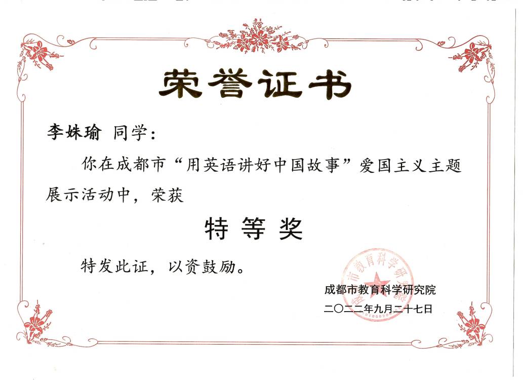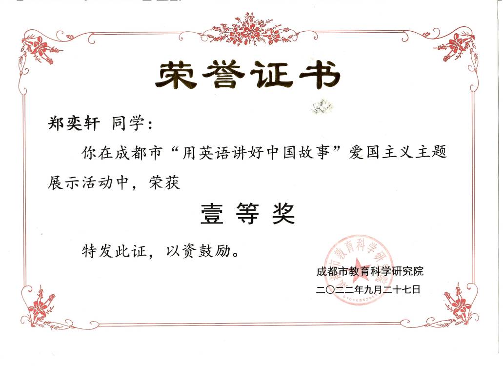 为深入领会和践行习近平总书记提出的“要向世界阐释推介更多具有中国特色、体现中国精神、蕴藏中国智慧的优秀文化”的重要讲话精神,将爱国主义教育与学科教育进行深度融合,坚持培根铸魂,启智增慧,聚焦立德树人的根本任务,我校积极参与成都市2022年首届“用英语讲好中国故事”爱国主义主题展示活动。经过激烈的角逐,我校学生李姝瑜荣获成都市特等奖,并在省级评选中荣获四川省一等奖。郑奕轩获成都市一等奖;张宇辰、黄茜获成都市二等奖。