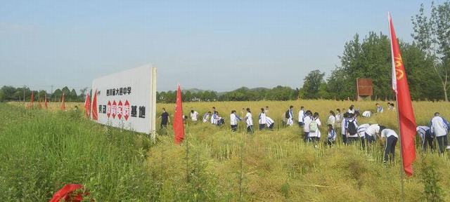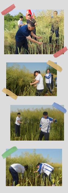“两只脚分开,稍微弯腰,左手紧握油菜秸秆,右手握住镰刀,刀口向下,向身体反方向用力……”正式收割开始前,老师们耐心地为同学们演示油菜的收割方法,提醒他们注意安全,同学们以班级为单位划分为6个“生产队”展开了劳动竞赛。