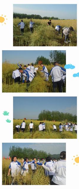 同学们个个充满新奇,干劲十足,戴好手套、拿起镰刀,排着长队有序走进油菜田里。老师一声令下,有的挥着镰刀割,有的负责堆放整理,大家干得热火朝天,经过一个多小时的辛勤劳作,割好的油菜被一摞摞地垒在田地间。