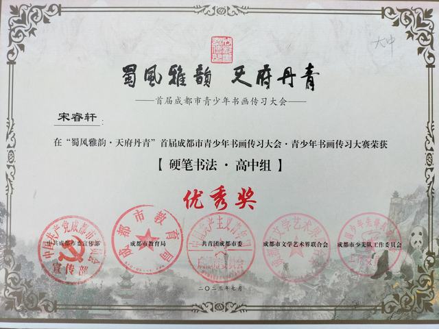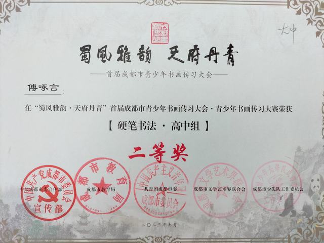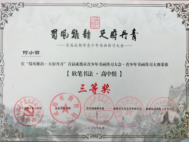 我校学生何小萌、宋睿轩、傅啄言、陶蕊在“蜀风雅韵、天府丹青”首届成都市青少年书画传习大会。青少年书画传习大赛中获奖