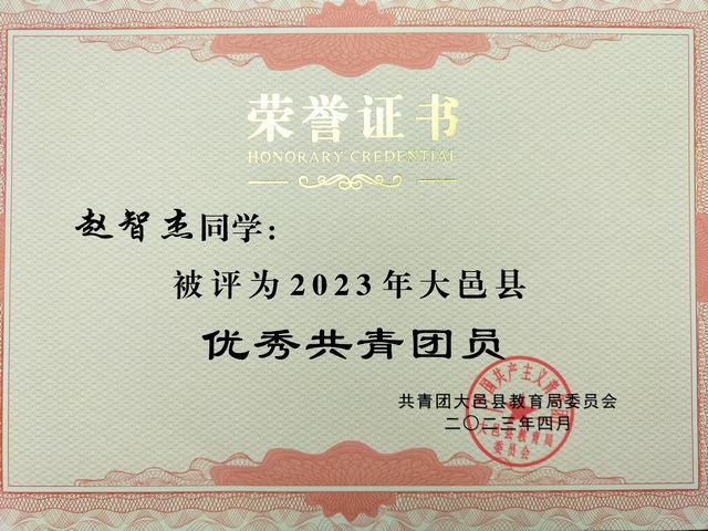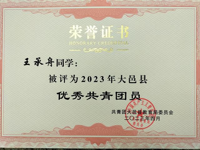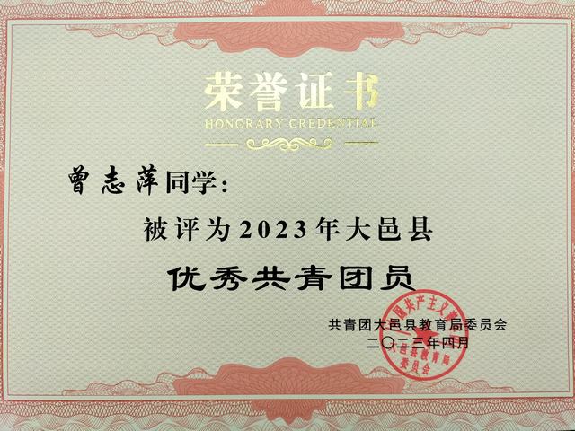 我校学生李澄江、曾志萍、王承舟、赵智杰被评为2023年大邑县优秀共青团员