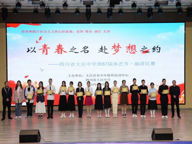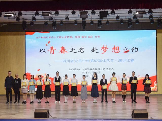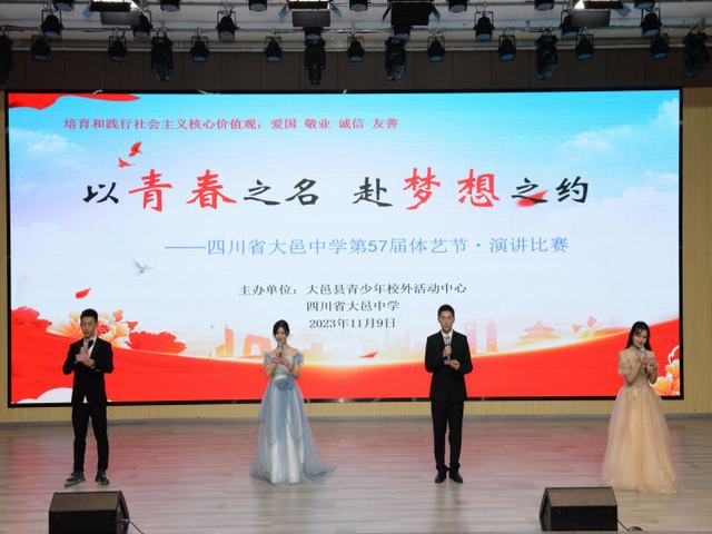 为落实立德树人根本任务,引领广大青少年树立远大理想,展现青春风采,挺膺担当时代责任,2023年11月9日晚,四川省大邑中学举行“以青春之名 赴梦想之约”主题演讲比赛。