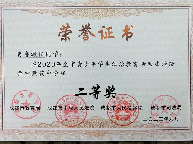 我校学生肖鲁澋阳在2023年成都市青少年学生法治教育活动法治绘画中荣获中学组二等奖
