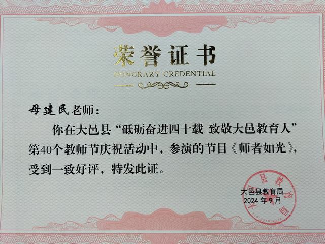 我校教师母建民在第40个教师节庆祝活动中,参演的节目《师者如光》,受到一致好评。