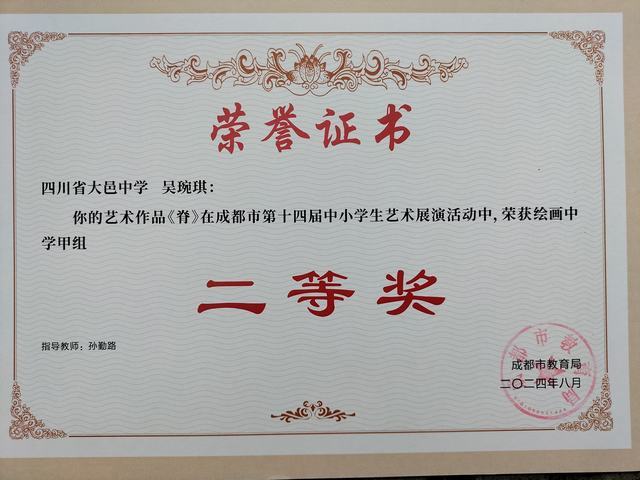 我校学生吴琬琪在成都市第14届中小学生艺术展演活动中荣获绘画中学甲组二等奖