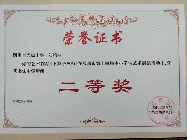 我校学生刘腾翌在成都市第14届中小学生艺术展演活动中荣获书法中学甲组二等奖