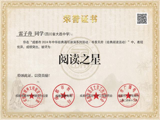 我校学生雷子周在成都市2024年经典阅读活动中被评为阅读之星