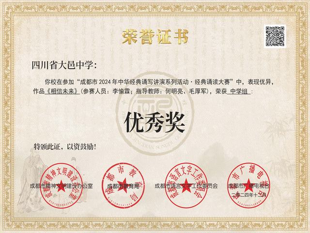 我校学生李愉霖在成都市2024年经典诵读大赛中荣获优秀奖