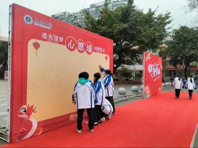 2025年2月16日,当清晨的暖阳洒满校园,学生们踏入校门,迎接他们的是别具匠心的“蛇年追光”打卡墙。打卡墙以中国传统蛇年为主题,以灵动、喜气为设计灵感,寓意着新的起点与希望,学生们用荧光笔在心愿墙留下自己的名字和梦想寄语,寓意“蛇行千里,追光不息”。